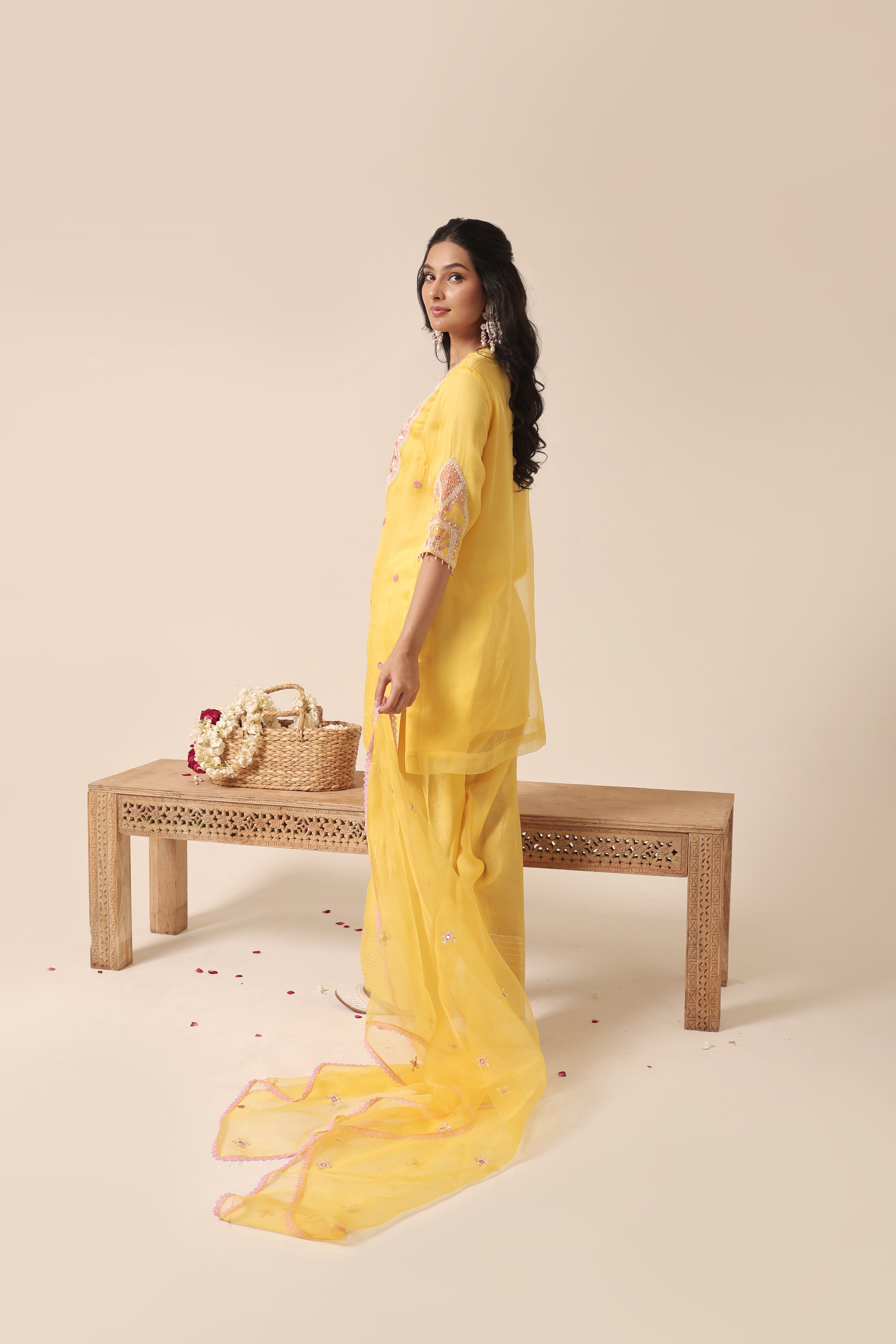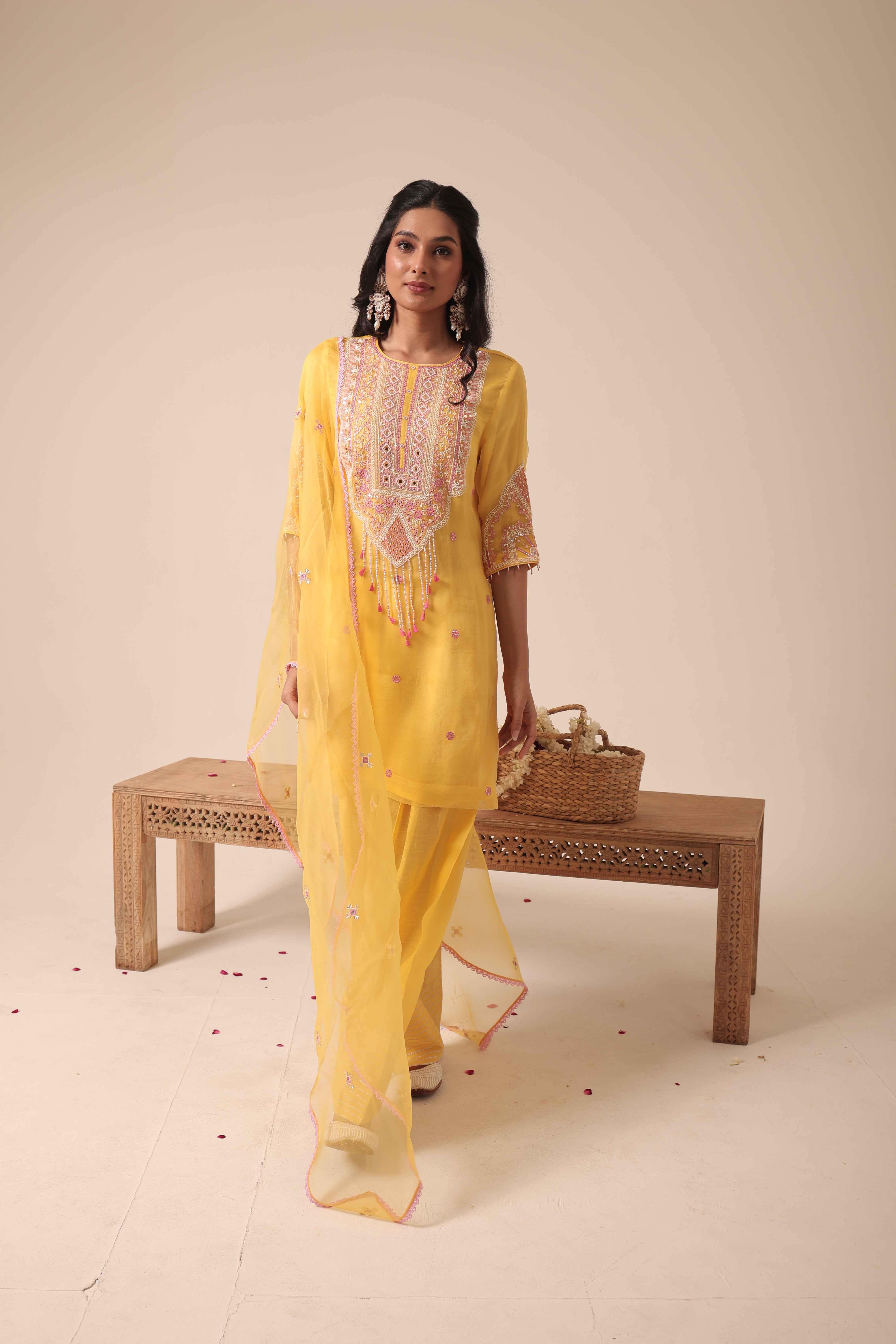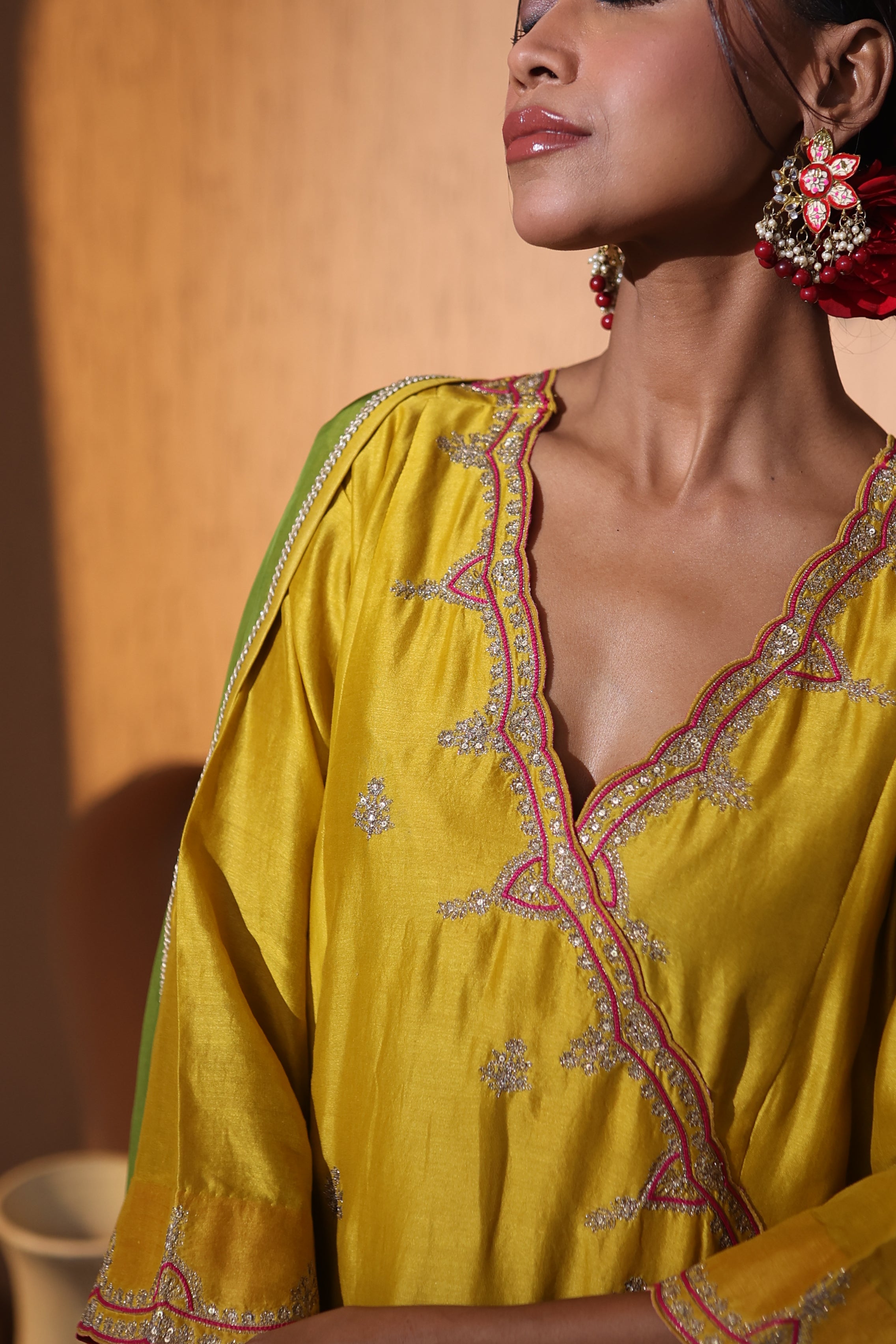 Mustard Yellow Chanderi Suit with Aari Tari Embroidery & Green Dupatta