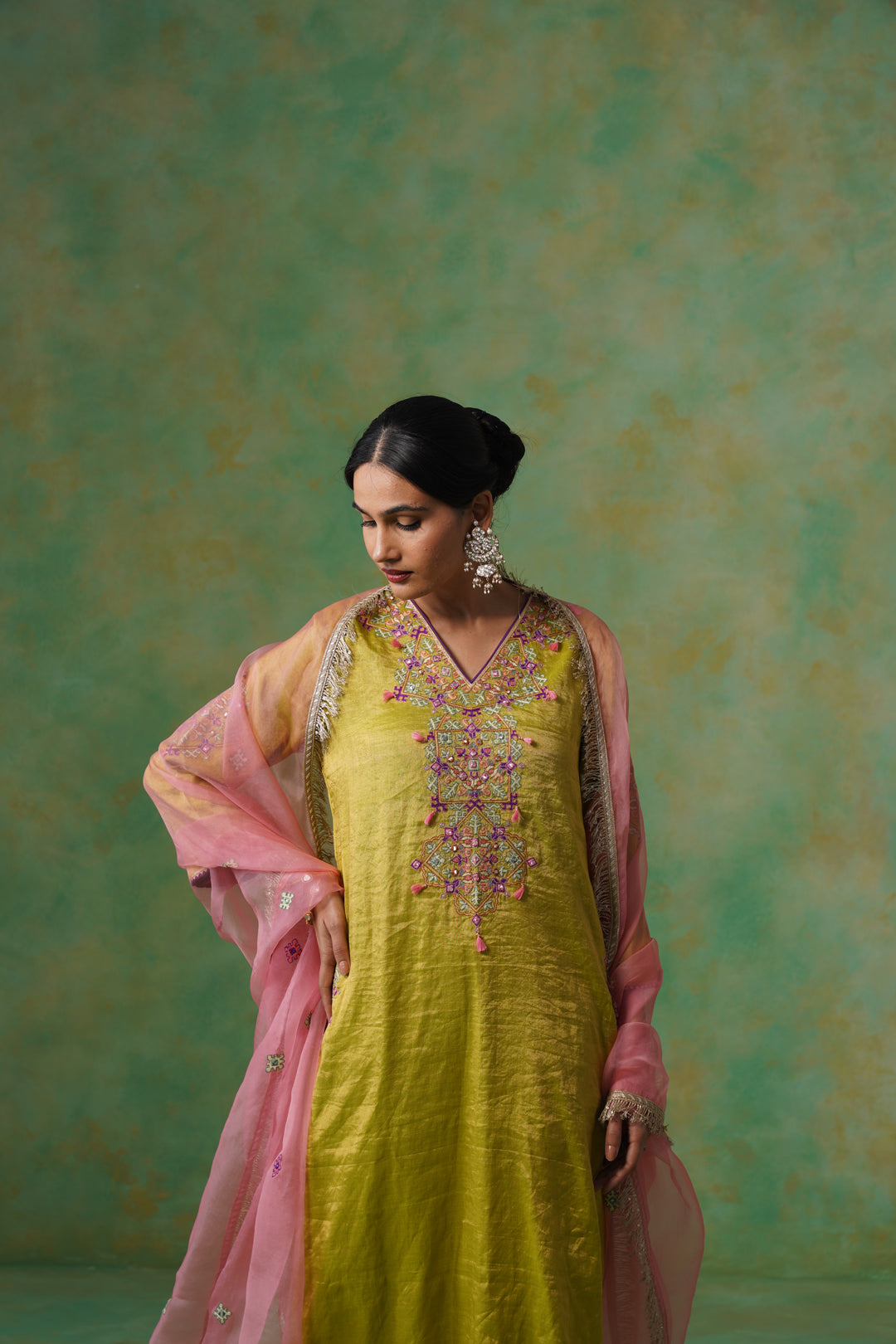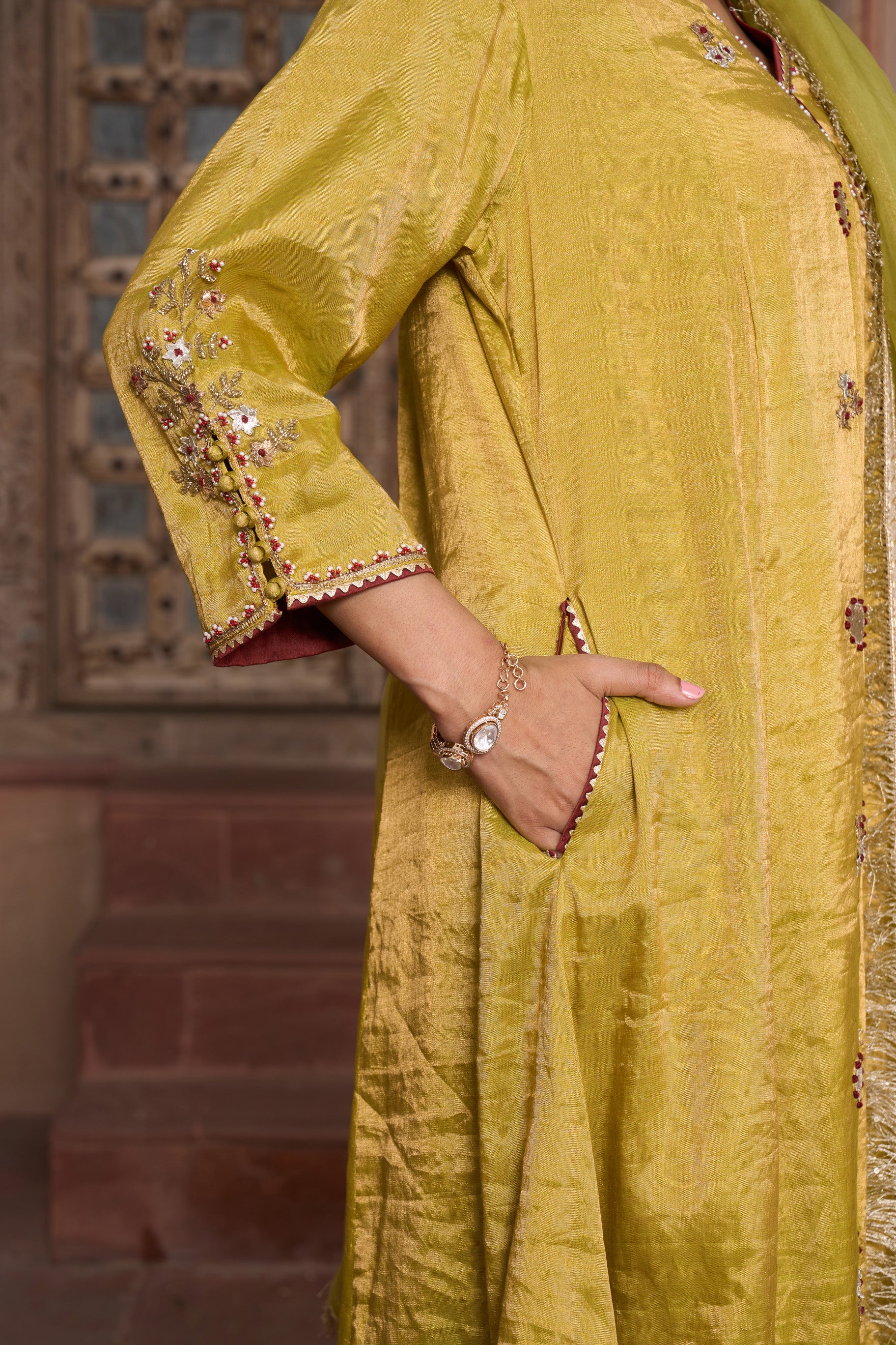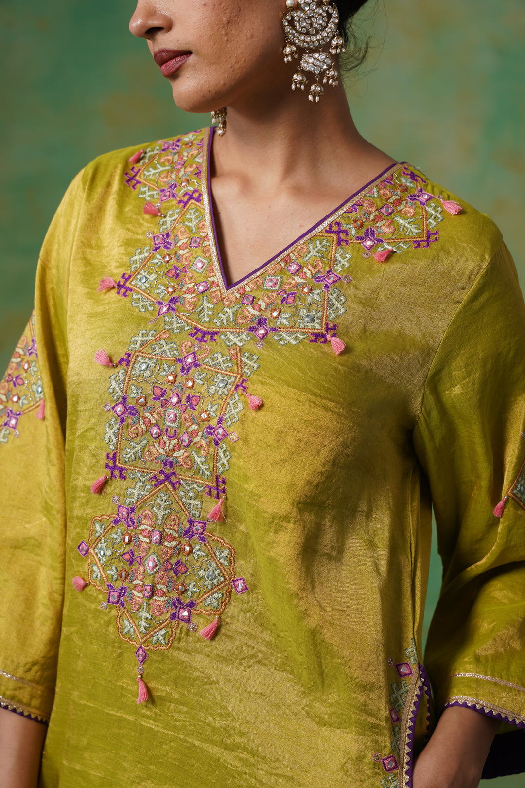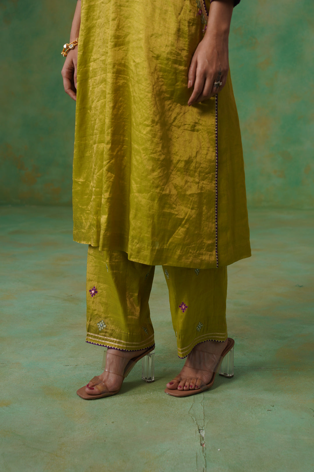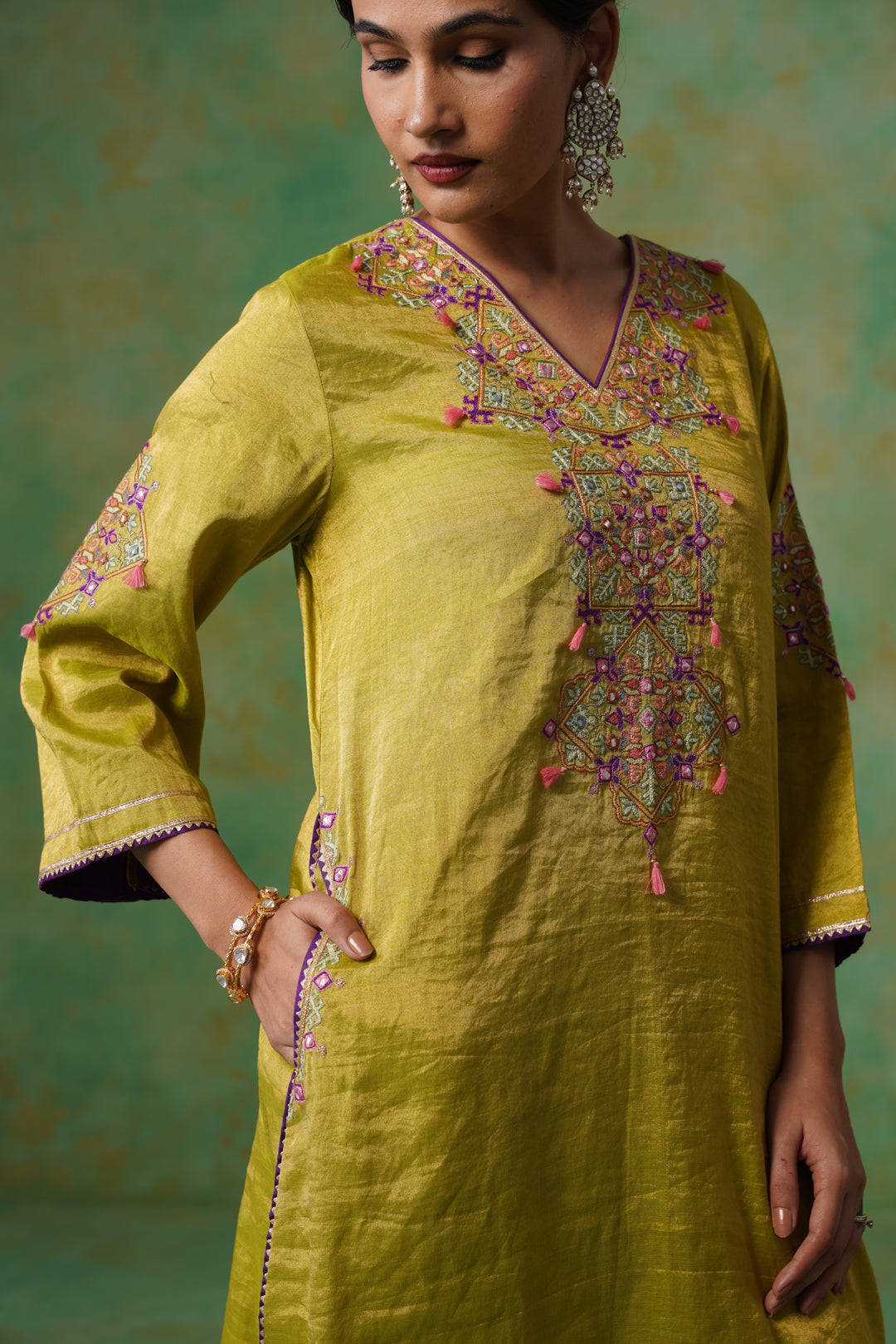 Green Silk Chanderi Kurta Set with Aari embroidery