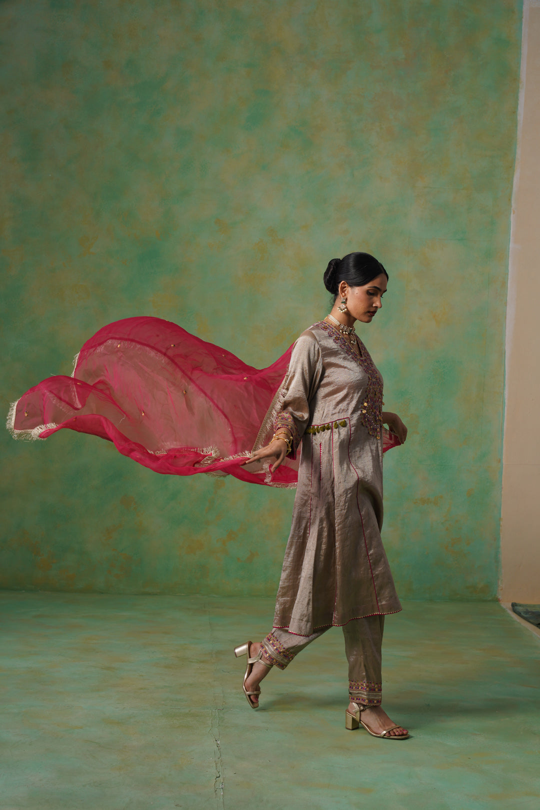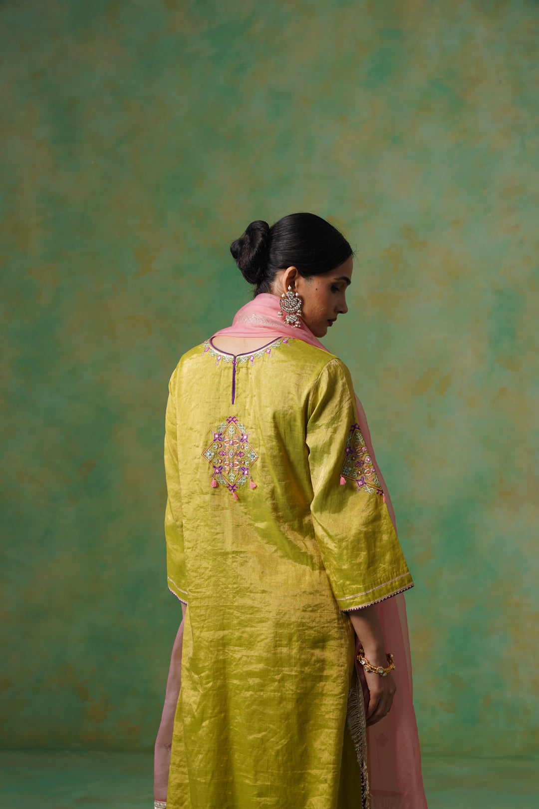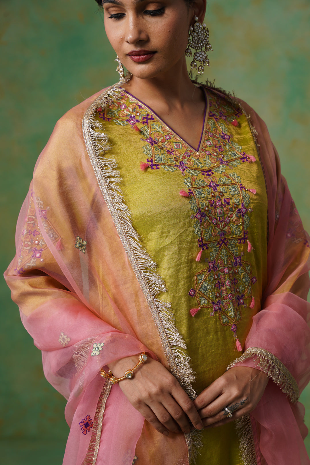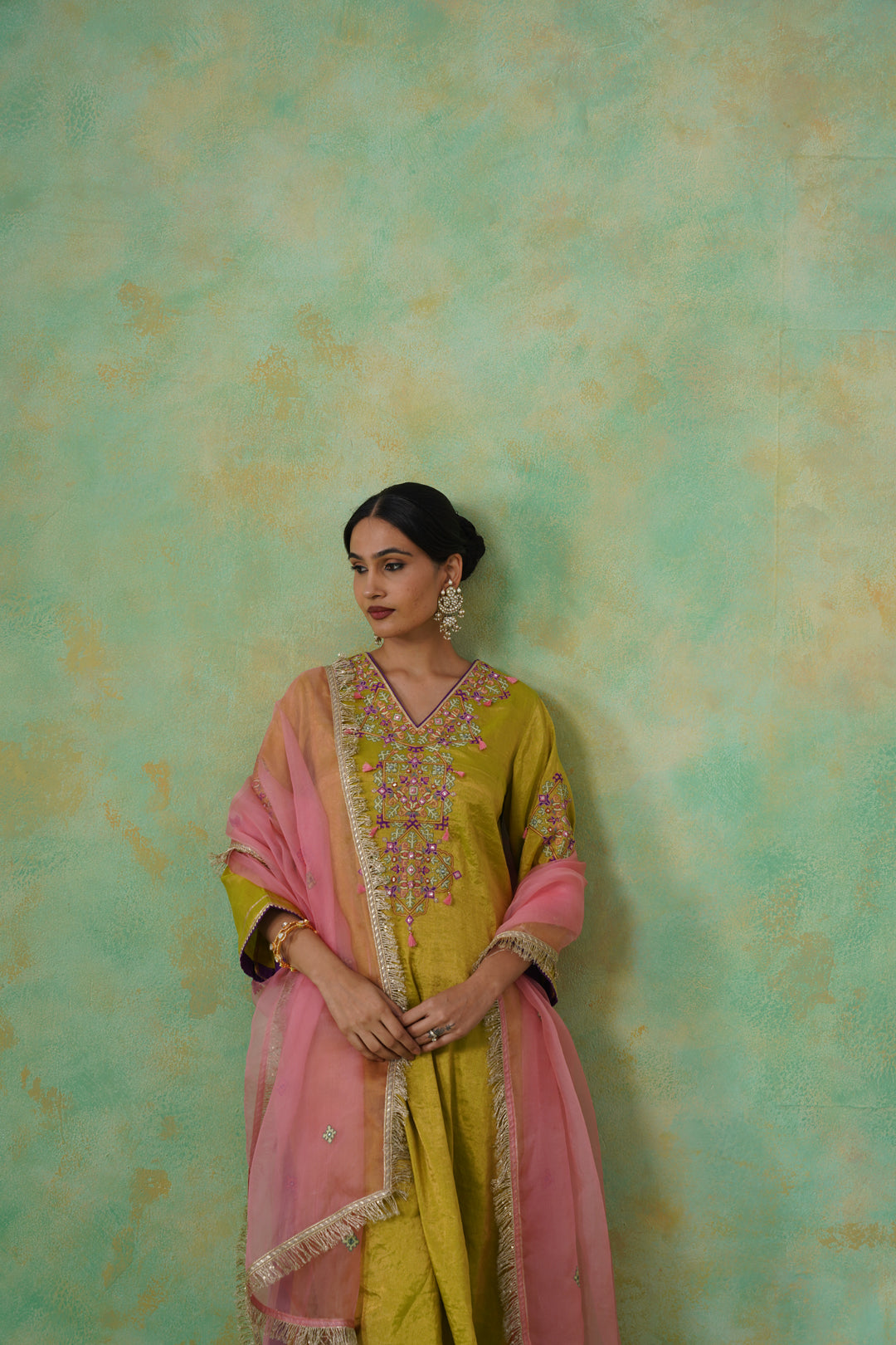 Green Silk Chanderi Kurta Set with Pink Dupatta