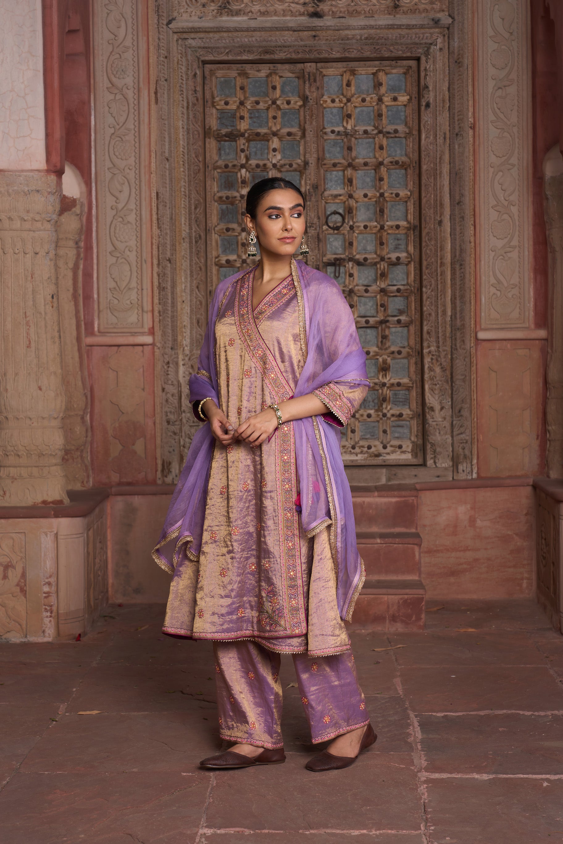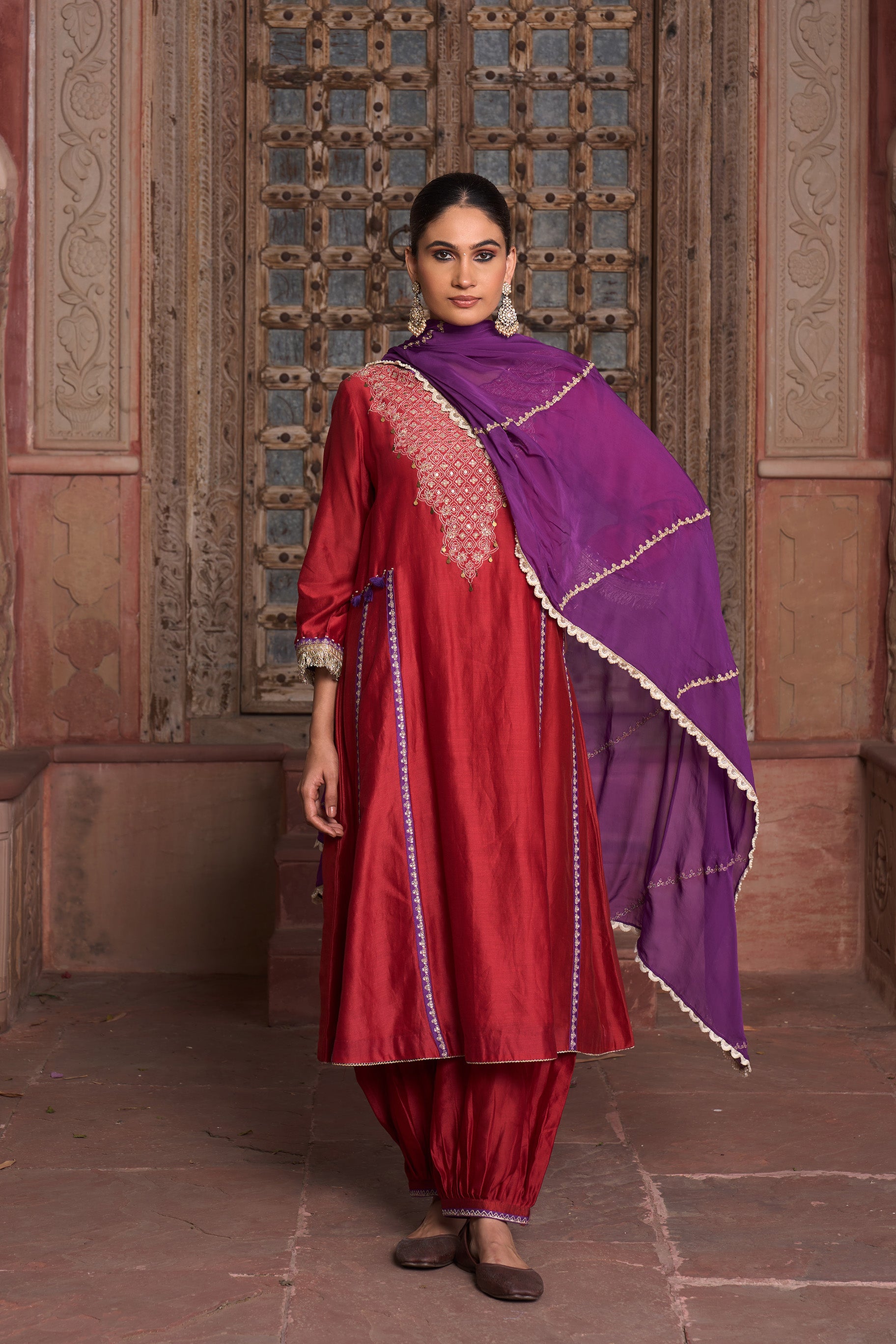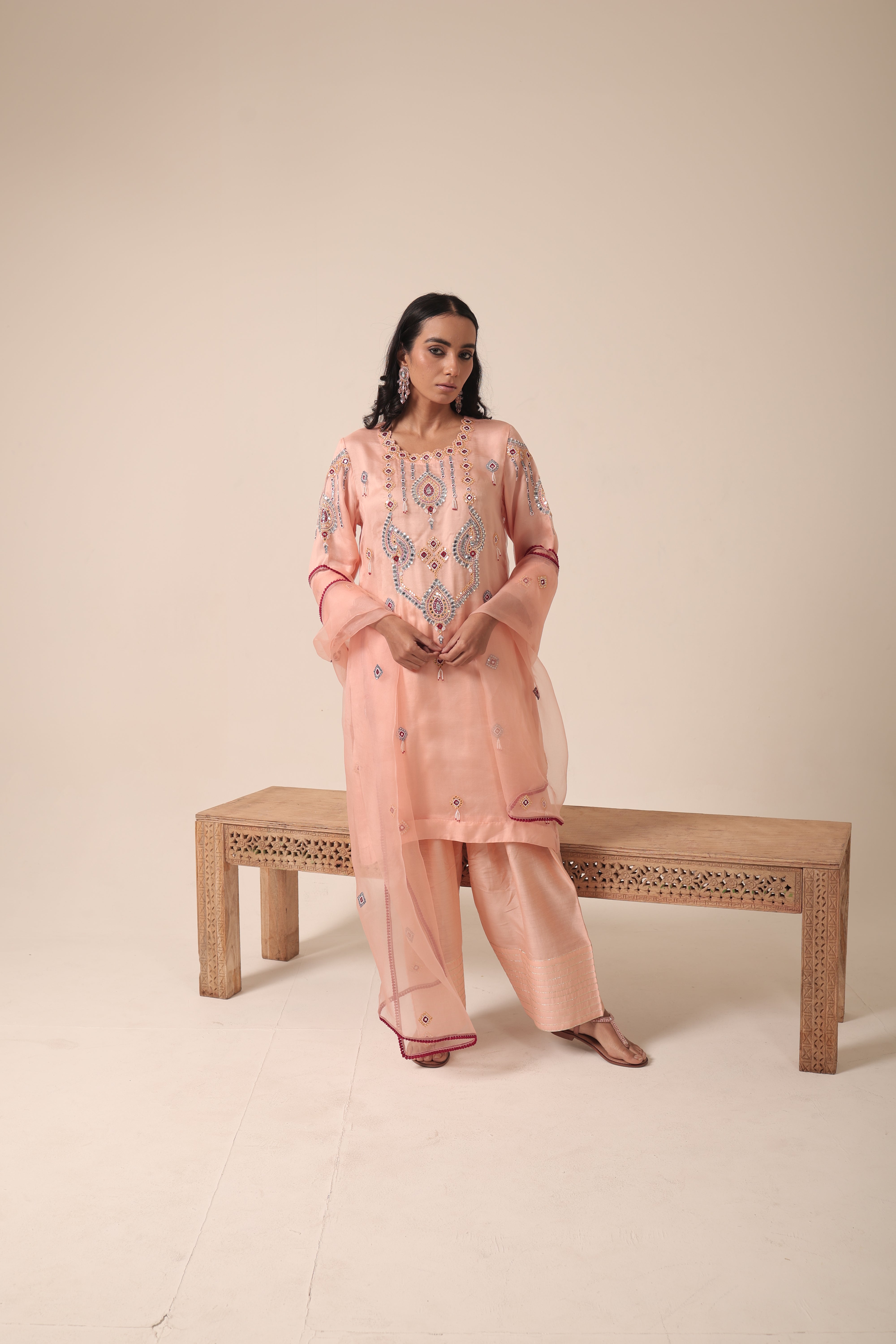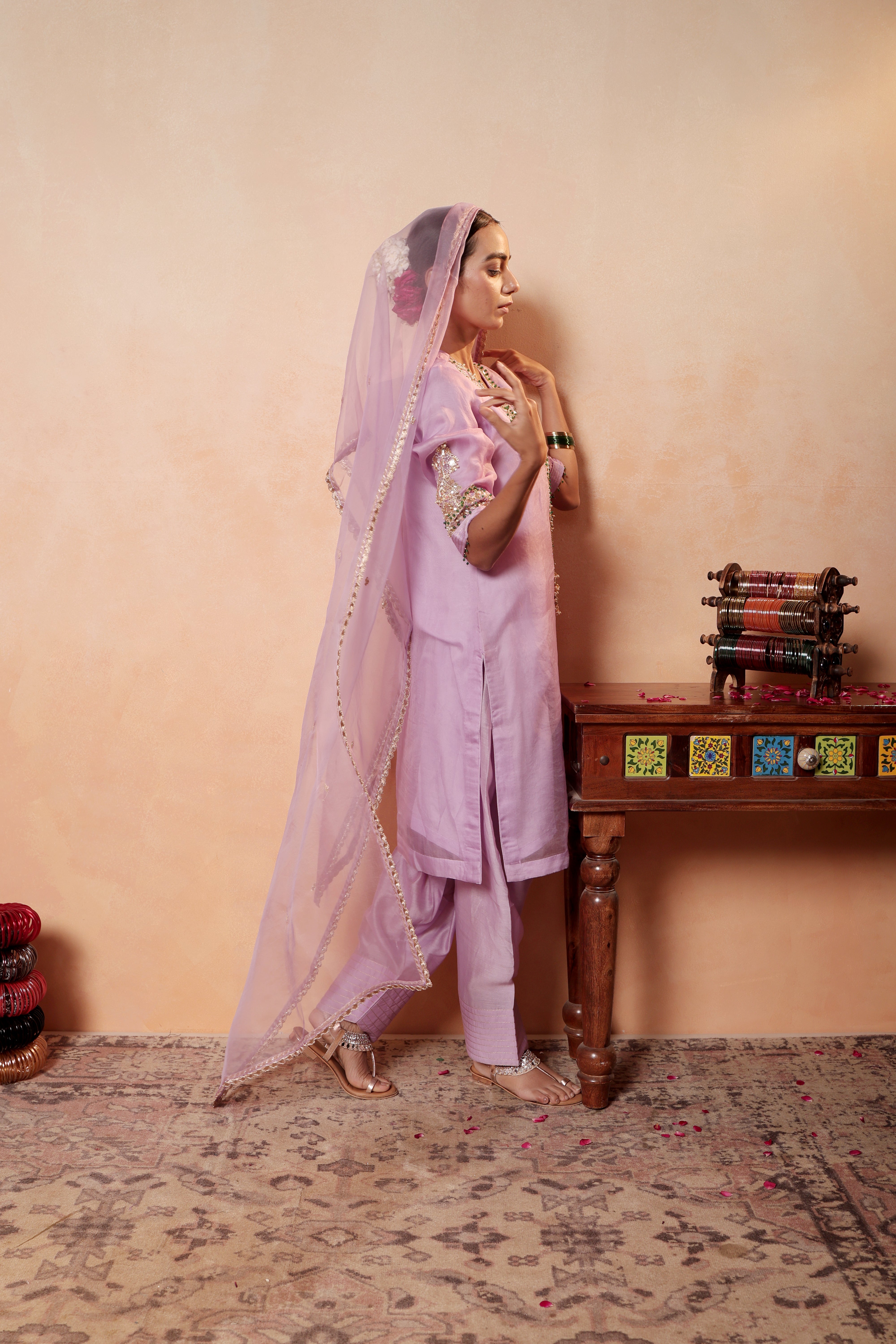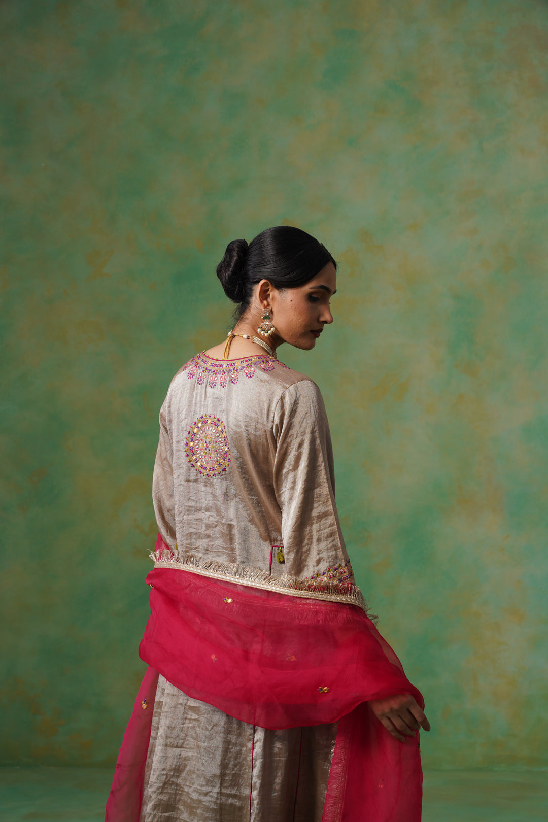 Green Silk Chanderi Kurta Set with Pink Dupatta