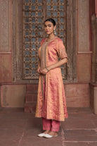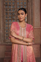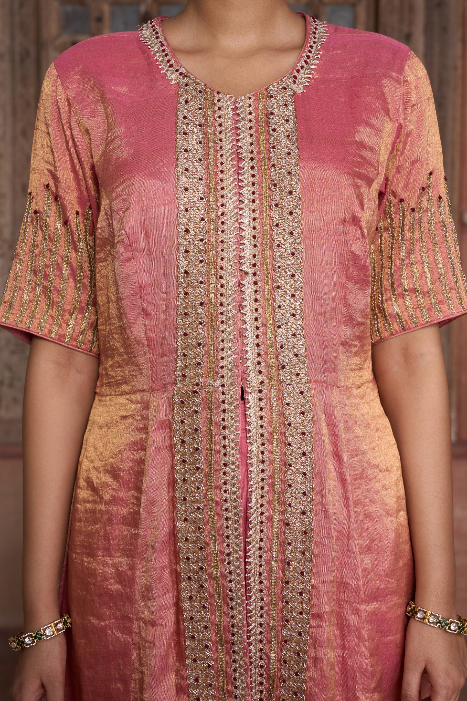 Radiate festive elegance in this stunning rust-orange A-line set, crafted in luxurious silk that drapes beautifully with every movement. The front panel features intricate hand-embellished detailing in shimmering zari, sequins, and beadwork, adding a regal touch to the rich, warm tones of the fabric. The fitted elbow-length sleeves are adorned with complementary embroidery, enhancing the outfit’s refined charm. Paired with coordinated straight pants highlighted with subtle gota accents, this ensemble blends traditional craftsmanship with contemporary grace.