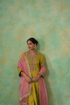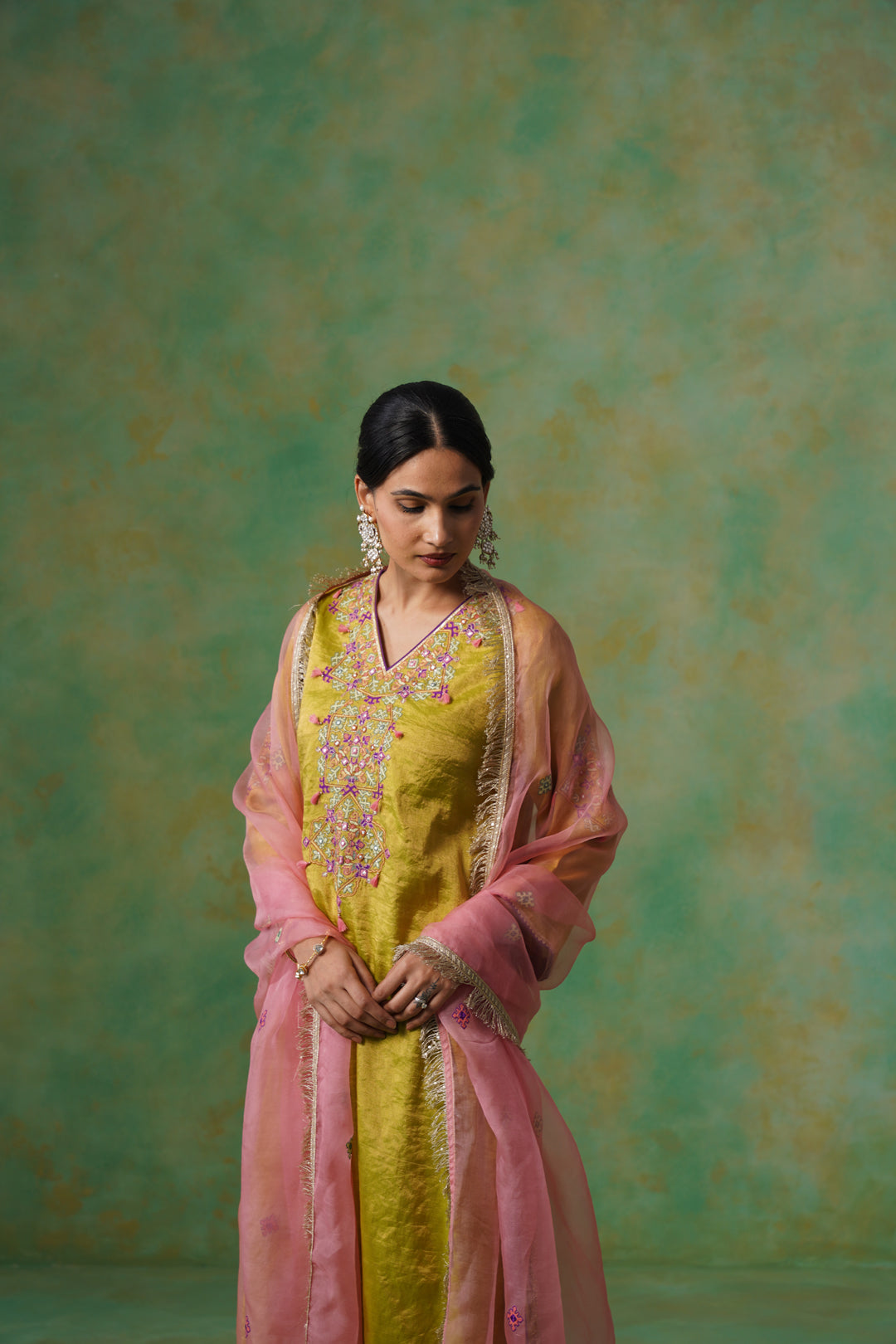 Make a striking statement with this lime-green silk kurta, crafted in a rich, lustrous fabric that exudes effortless luxury. The V-neckline is adorned with intricate multicolour embroidery, blending traditional motifs with fine threadwork and delicate tassel accents. The detailed embellishment along the neckline and sleeves adds depth and festive charm. Paired with a soft organza dupatta in pink and peach tones, finished with dainty embroidered motifs and subtle zari edges, the ensemble offers a perfect balance of vibrance and elegance.