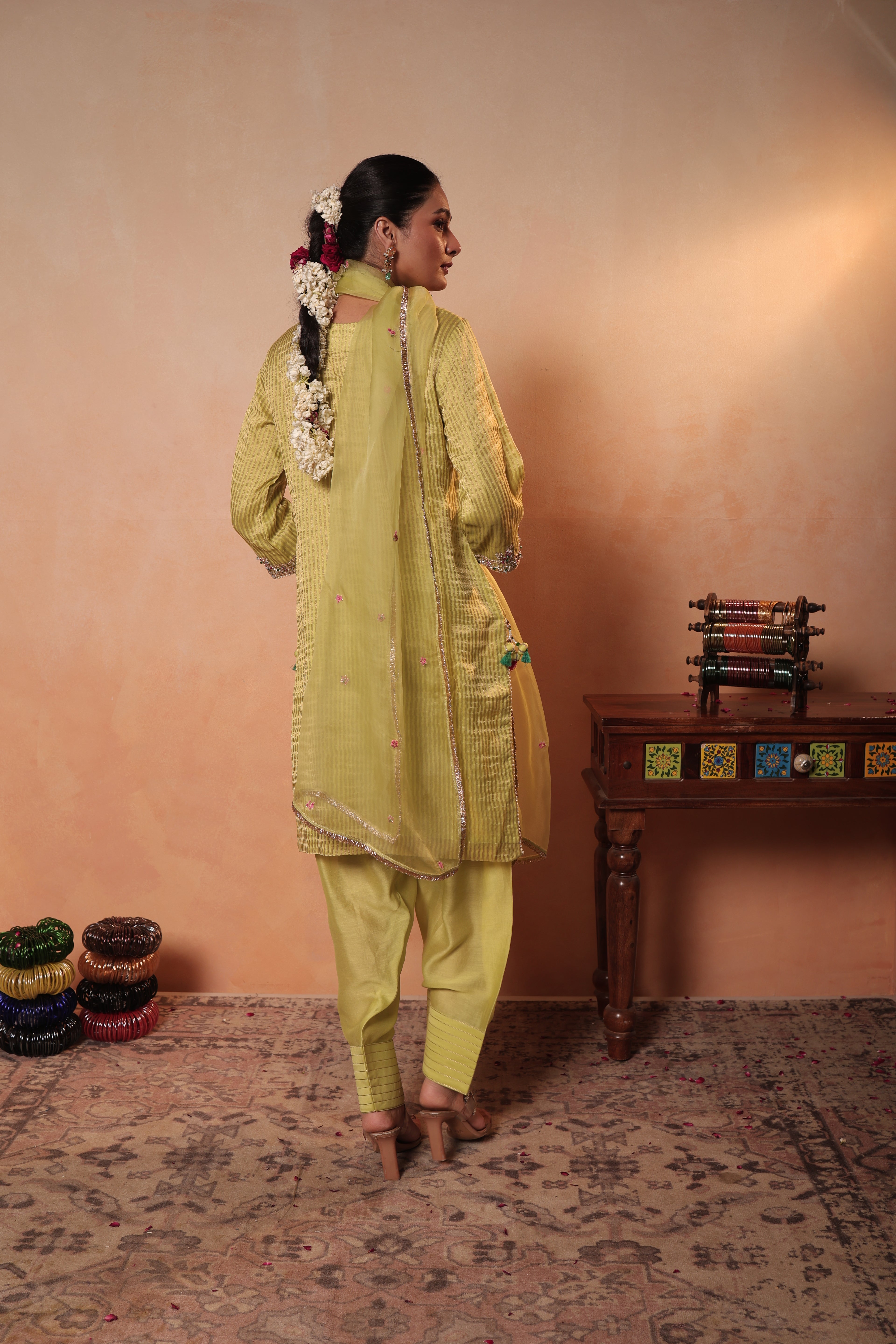Step into festive charm with this Lime Green Striper Tissue Kurta with Farshi Salwar from the Sunehri Gota Collection. The kurta, crafted in luxurious silk striper tissue, features gota embroidery and fine hand embellishments that bring a radiant glow to your festive look. The collection’s unique signature, the heritage-inspired farshi salwar, adds a touch of regal grandeur and sets this ensemble apart from classic kurta sets. Completed with a delicate dupatta, this design seamlessly blends traditional craftsmanship with modern elegance, making it an ideal choice for weddings, festive gatherings, and cultural celebrations.