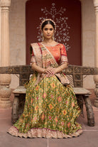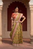 This exquisite ensemble is a celebration of rich heritage craft, luxurious textures, and festive elegance. The look features a beautifully woven green tissue ikat silk lehenga adorned with delicate motifs, creating a tapestry-like effect that is both vibrant and timeless. Paired with the blouse is a mustard-yellow, crafted in a lustrous fabric.
