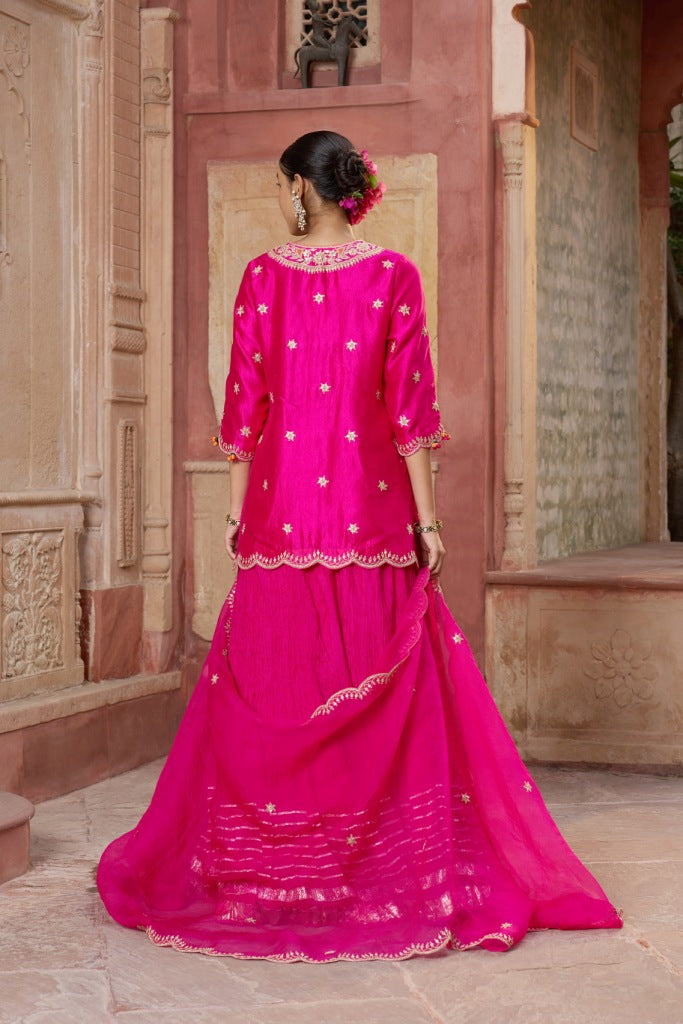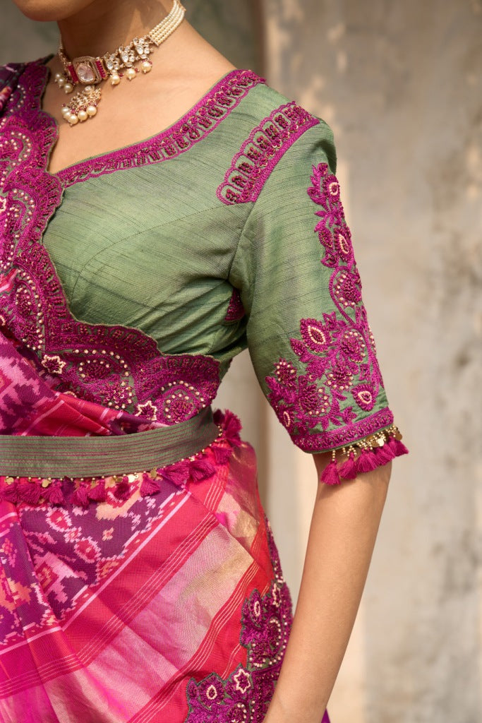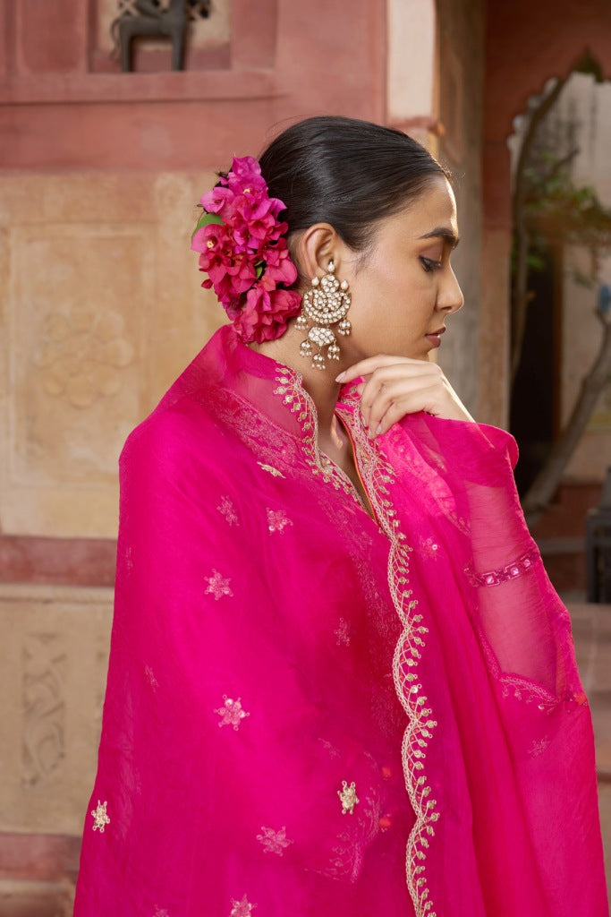 Green Silk Chanderi Kurta Set with Pink Dupatta