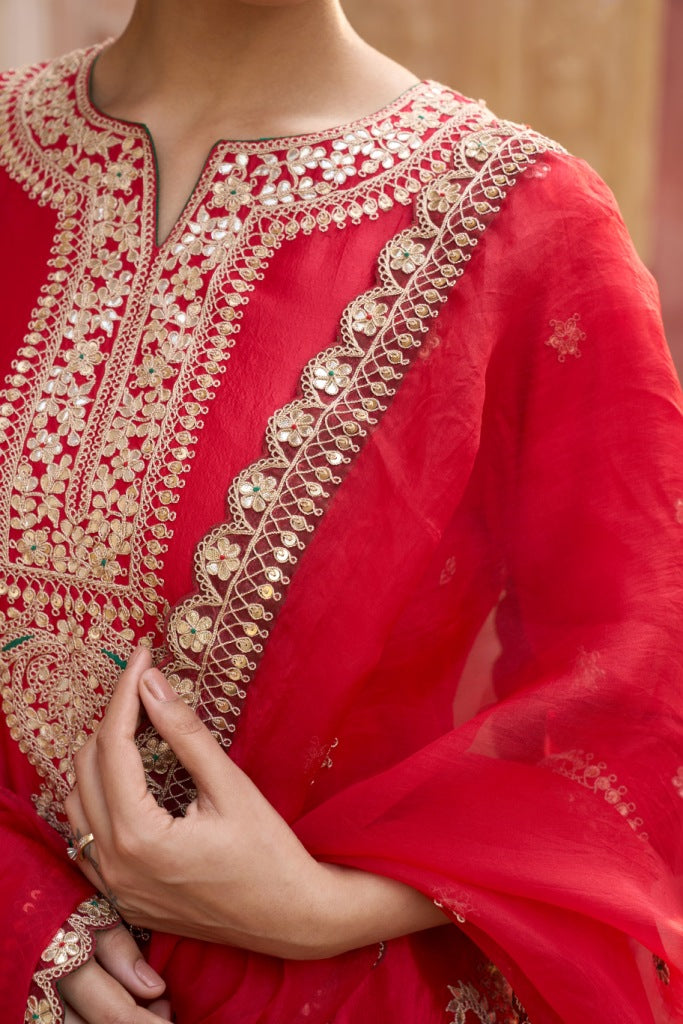 Orange Silk Chanderi Kurta Set with Gold Zari Hand Embroidery