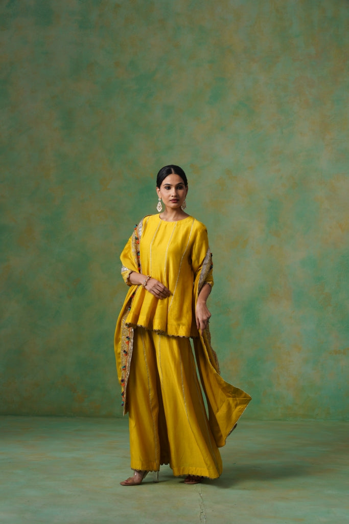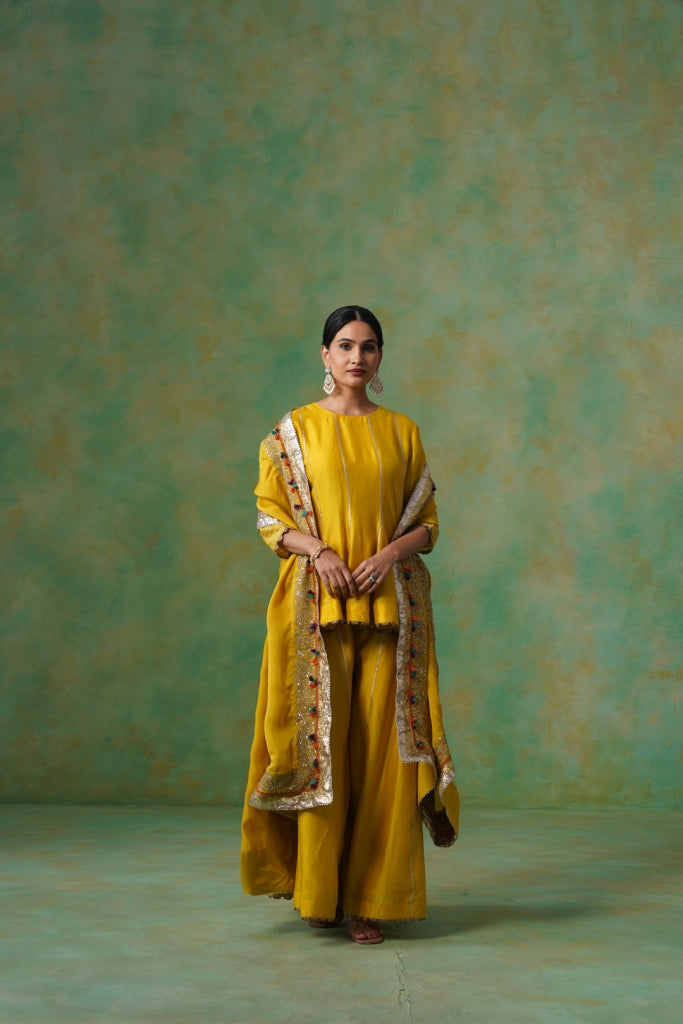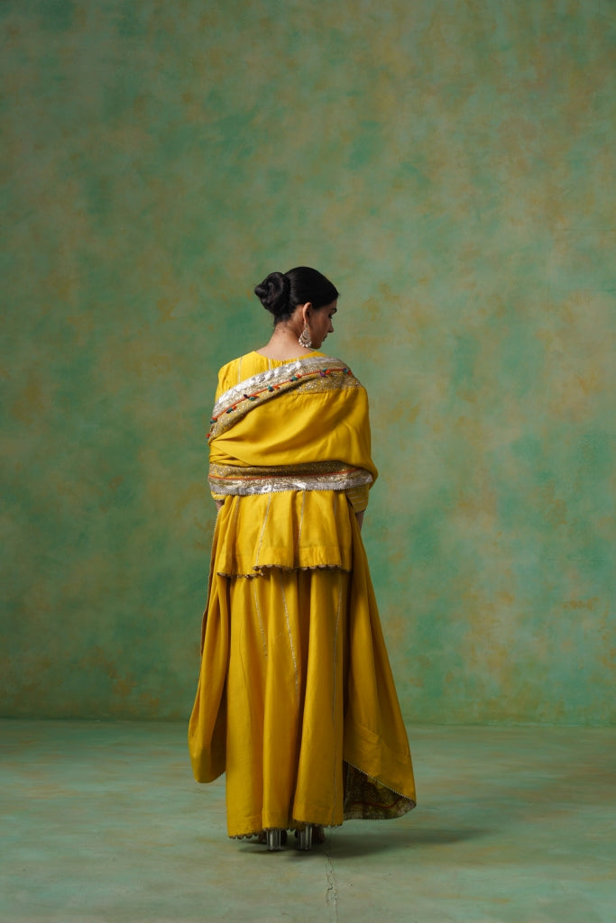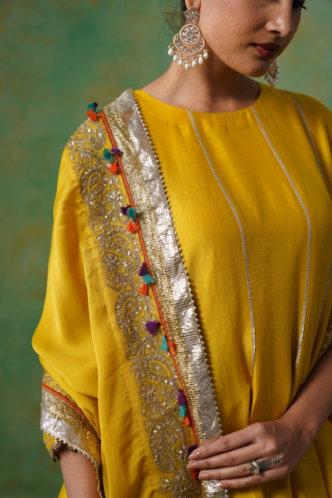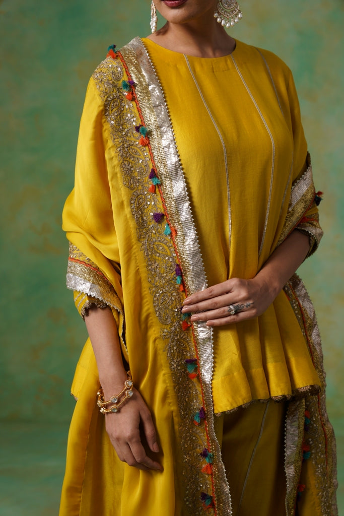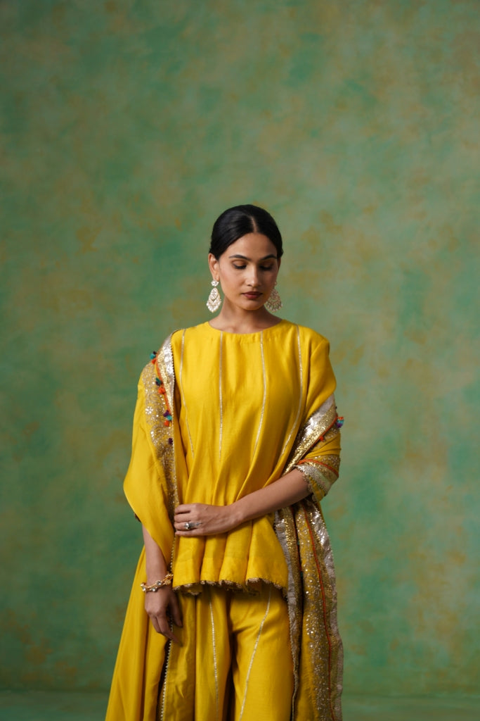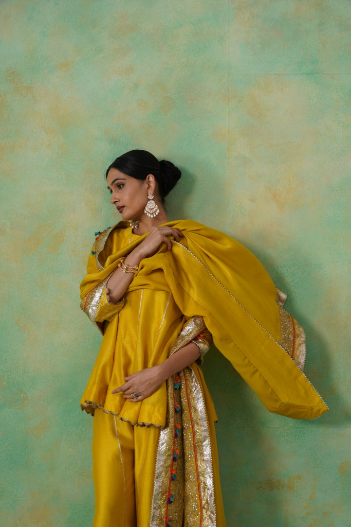 Mustard Yellow Chanderi Suit with Aari Tari Embroidery & Green Dupatta