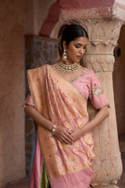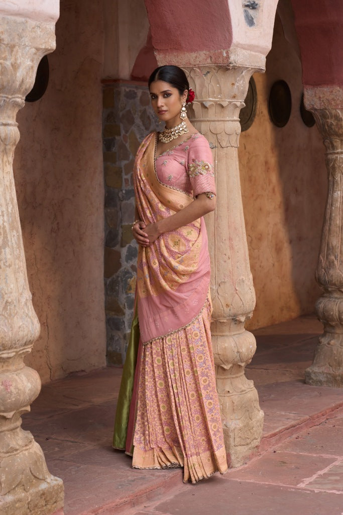 This elegant pink lehenga saree set perfectly captures the essence of tradition, grace, and refined artistry. The lehenga is adorned with muted gold gota work that beautifully contrasts the soft pink base, while intricate zardosi embroidery lends richness and dimension to the ensemble.