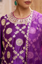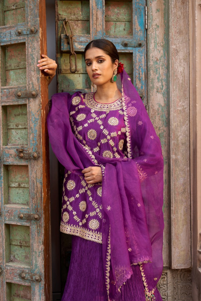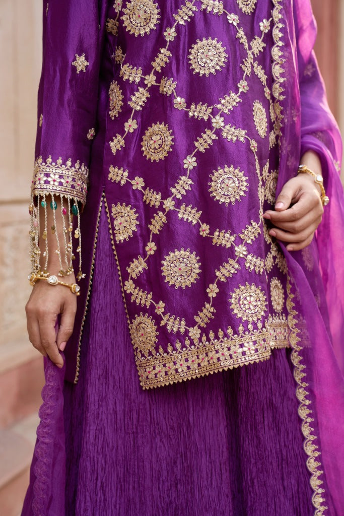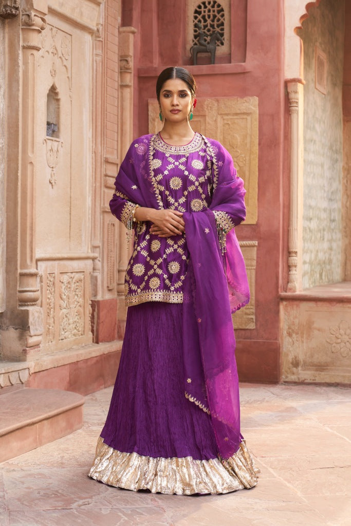 This Purple lehenga set captures the essence of festive grandeur and timeless tradition. The kurta, crafted in a rich purple shade, is adorned with intricate gold gota patti work along the neckline,hem and all over the kurta reflecting exceptional artistry and attention to detail. The matching lehenga, made from crushed kora silk, flows effortlessly with every step and is finished with a radiant gold gota patti border that adds a touch of celebratory shimmer.