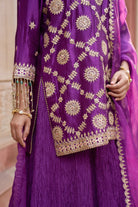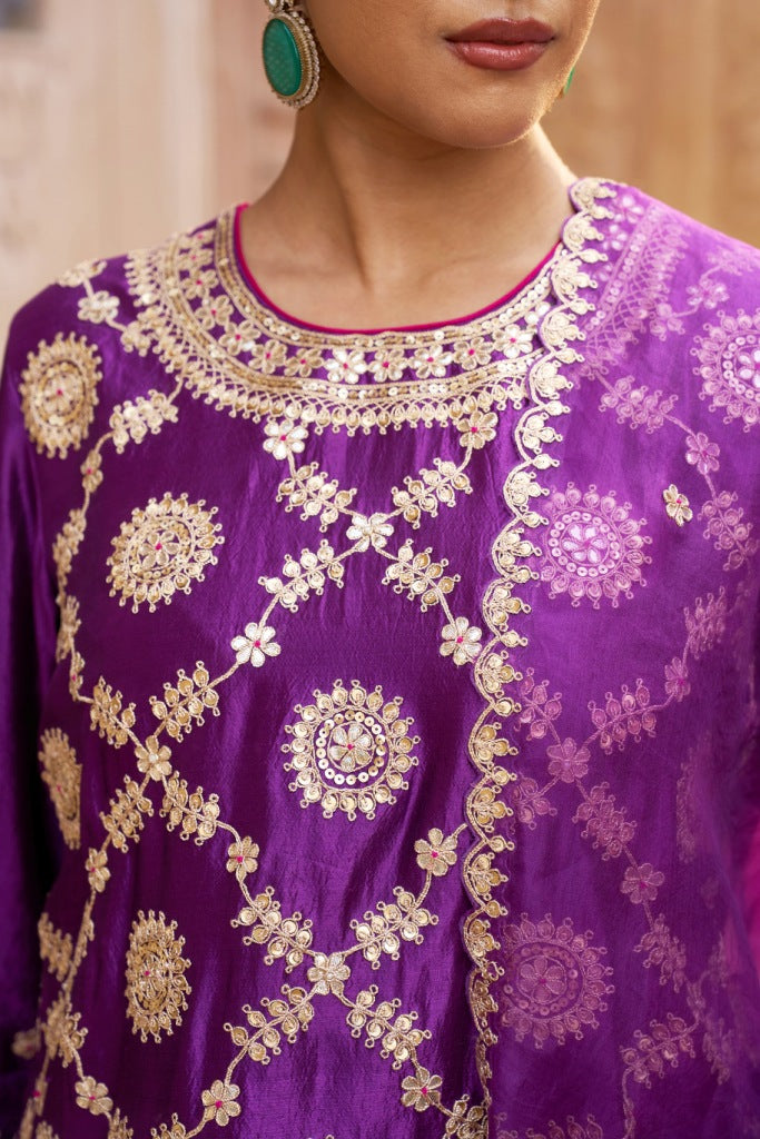 Completing the ensemble is a delicate purple dupatta, featuring finely embroidered motifs and a beautifully scalloped border that perfectly complements the kurta’s embellishments. Together, the pieces create a luxurious and gracefully coordinated look.