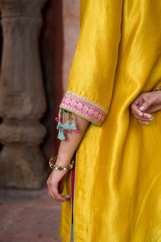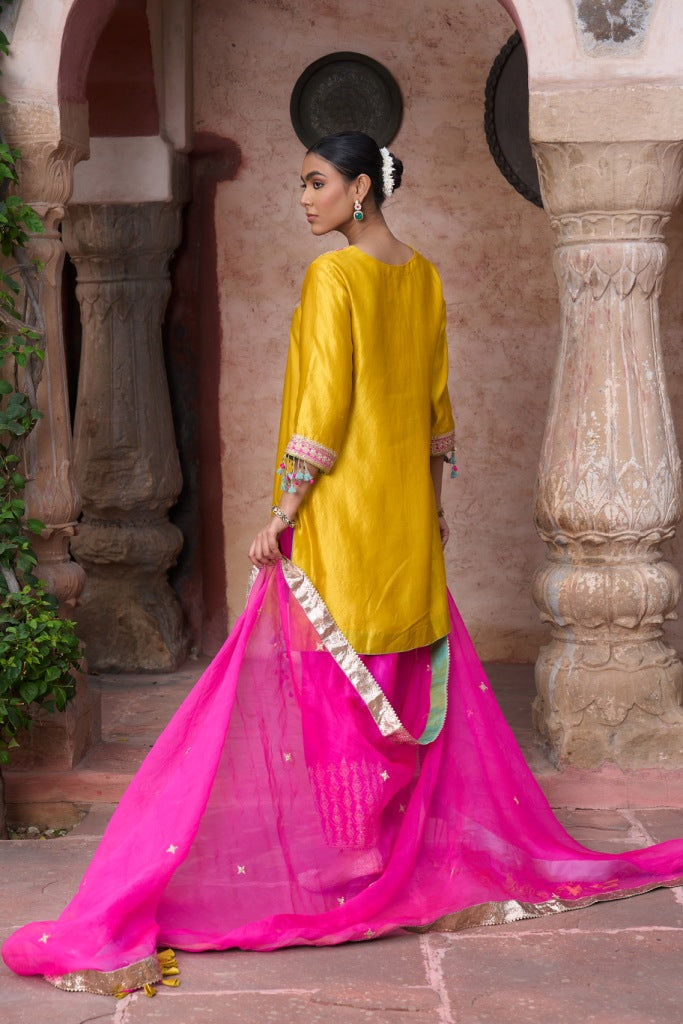 This vibrant mustard and hot pink set is a celebration of festive charm and playful elegance. The mustard kurta, crafted in kora silk fabric, features gota patti embroidery along the neckline and center motif, adding a touch of traditional artistry. The sleeves are finished with detailed borders and cheerful tassels, giving the outfit a lively and youthful appeal.